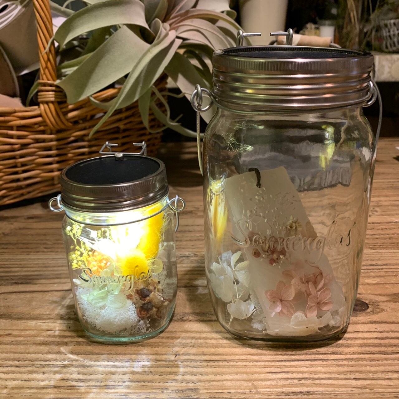 on/offで蓋がLEDで光る瓶型ソーラーランタン(ソネングラス大)にイエロー系のドライフラワーをアレンジします