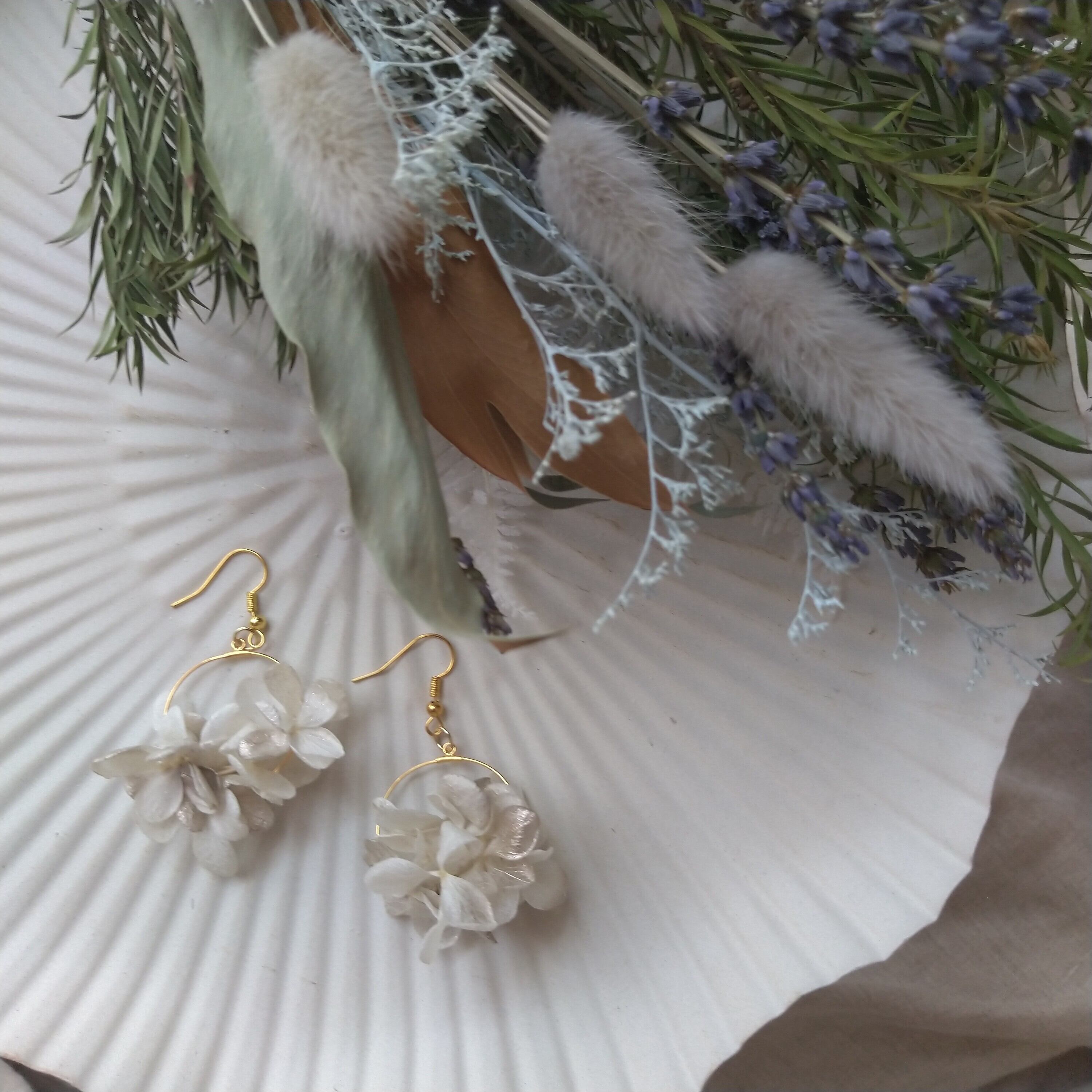 プリザーブドフラワーのアジサイを使った、フープピアスです。