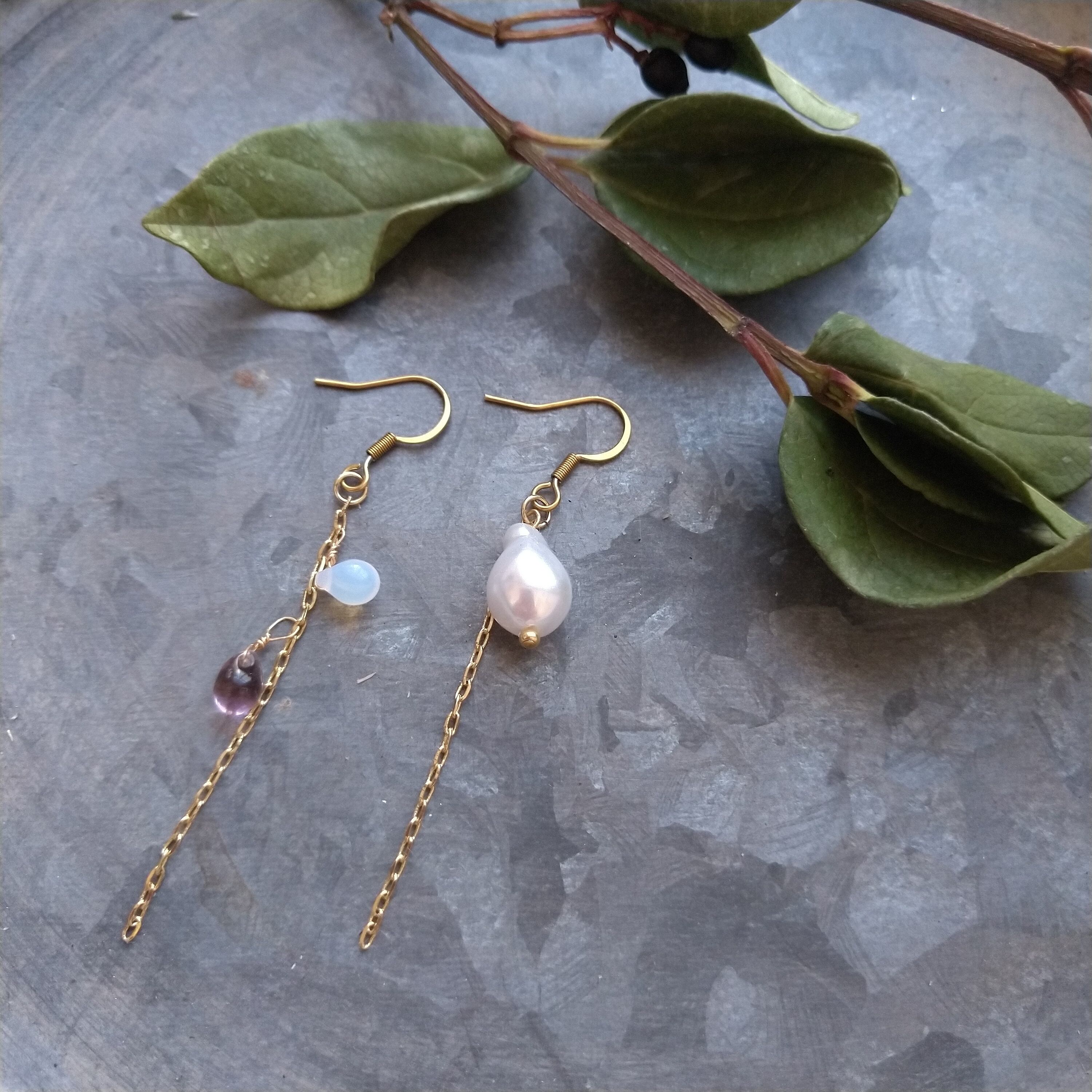 樹脂パールと雫形ビーズを使用した、左右別デザインのピアスです。