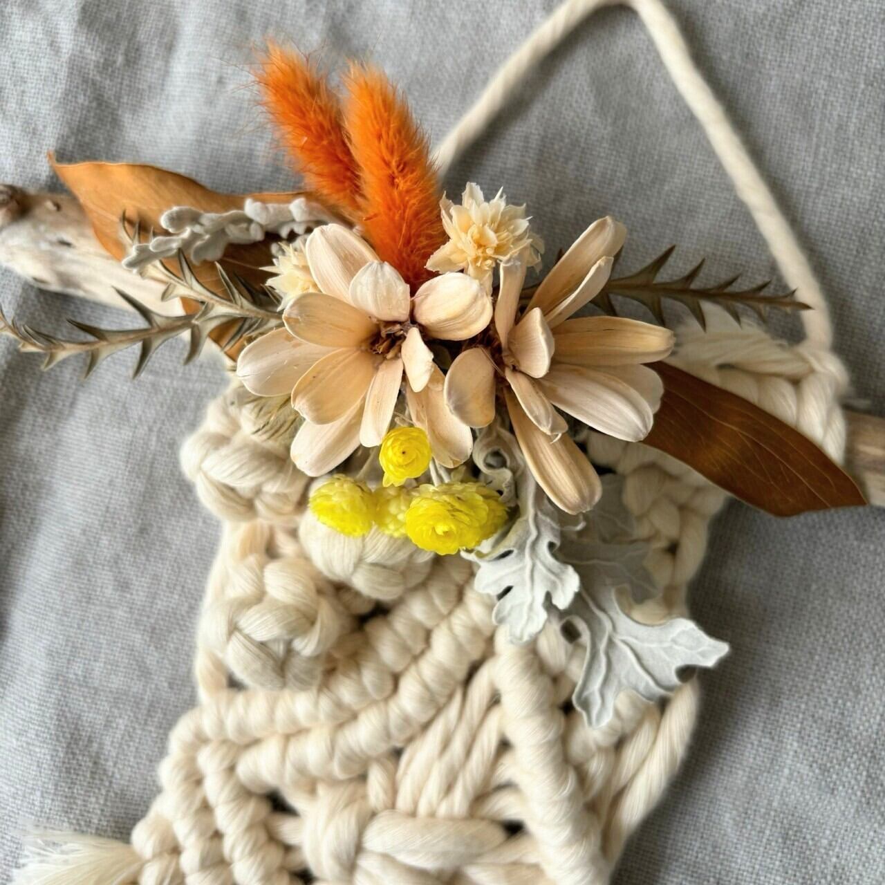 かわいいマクラメにドライフラワーをあしらったタペストリーです